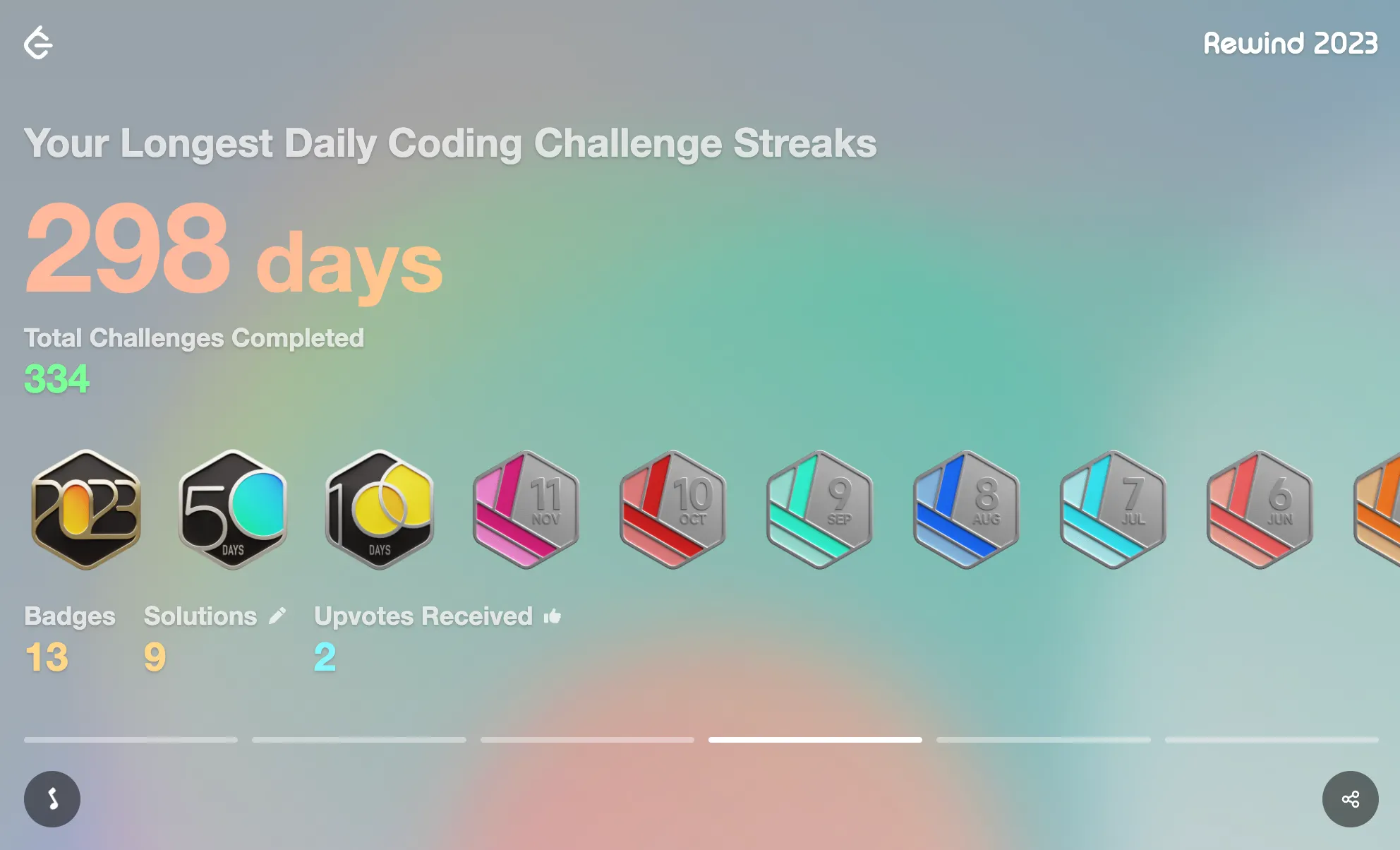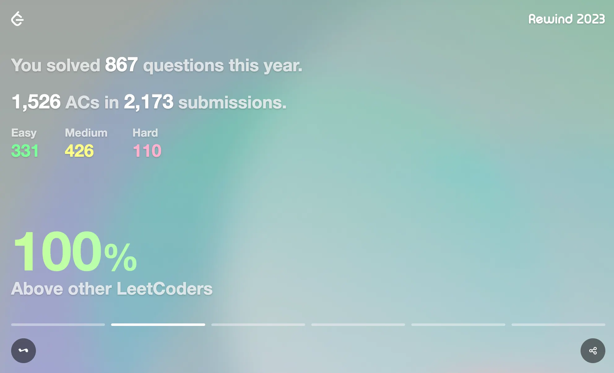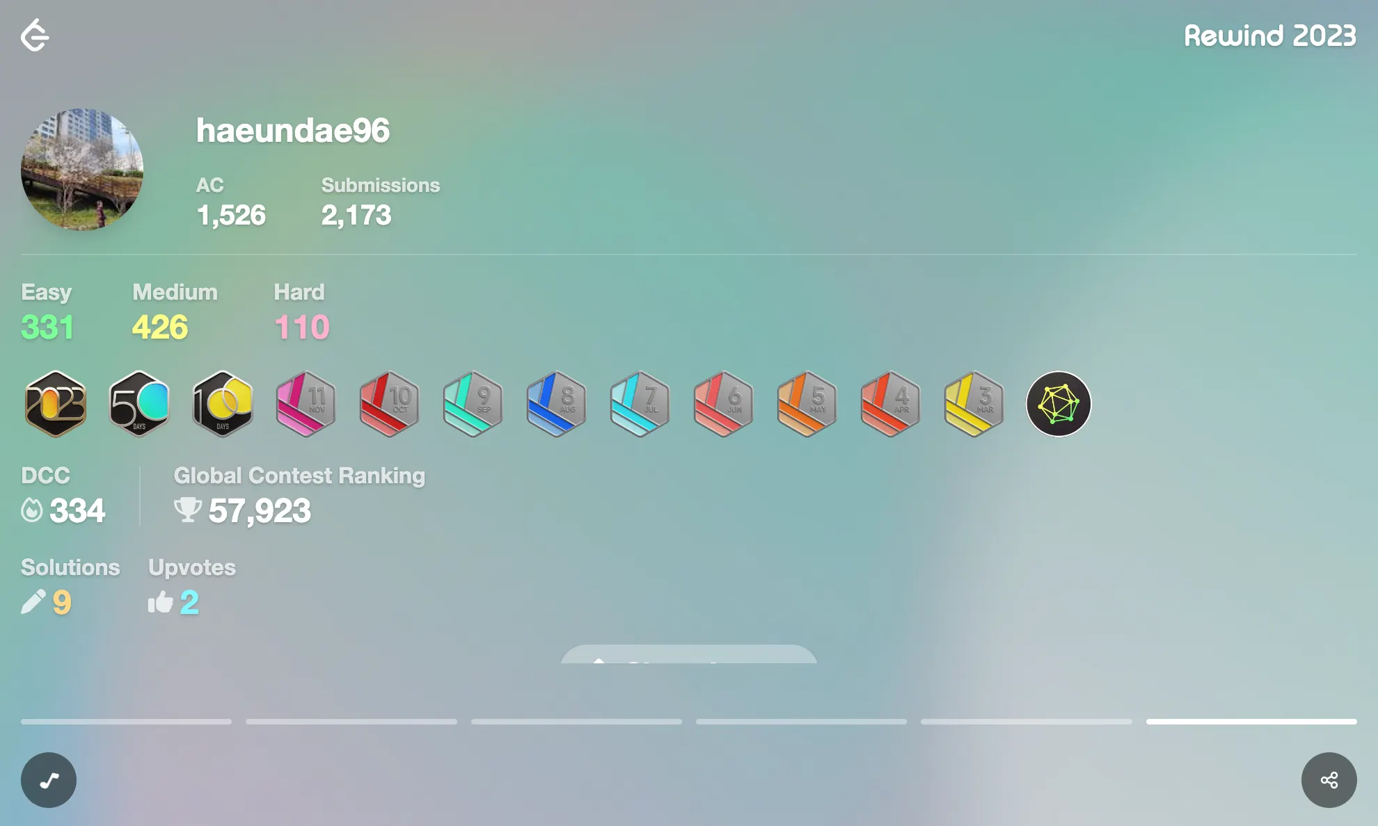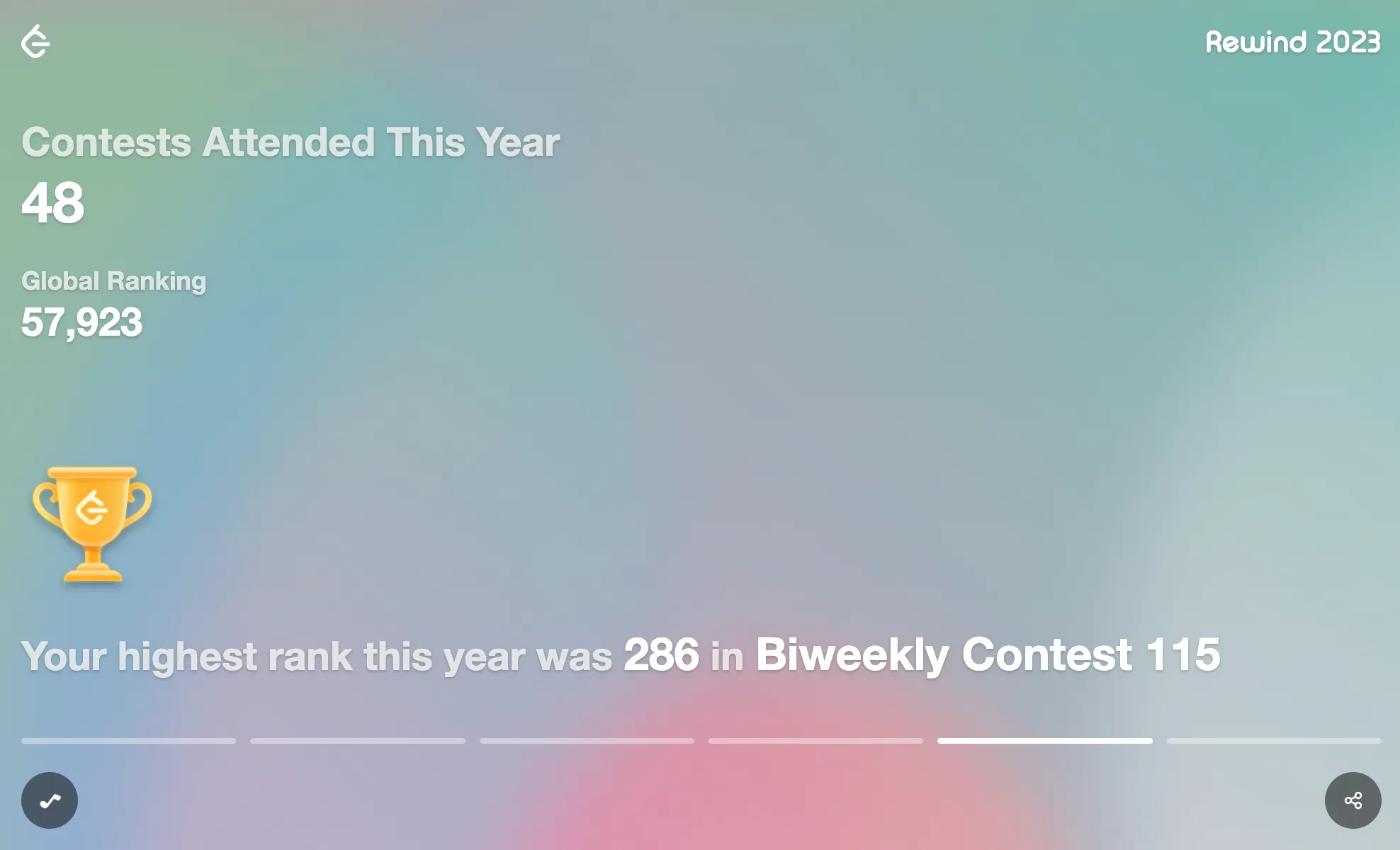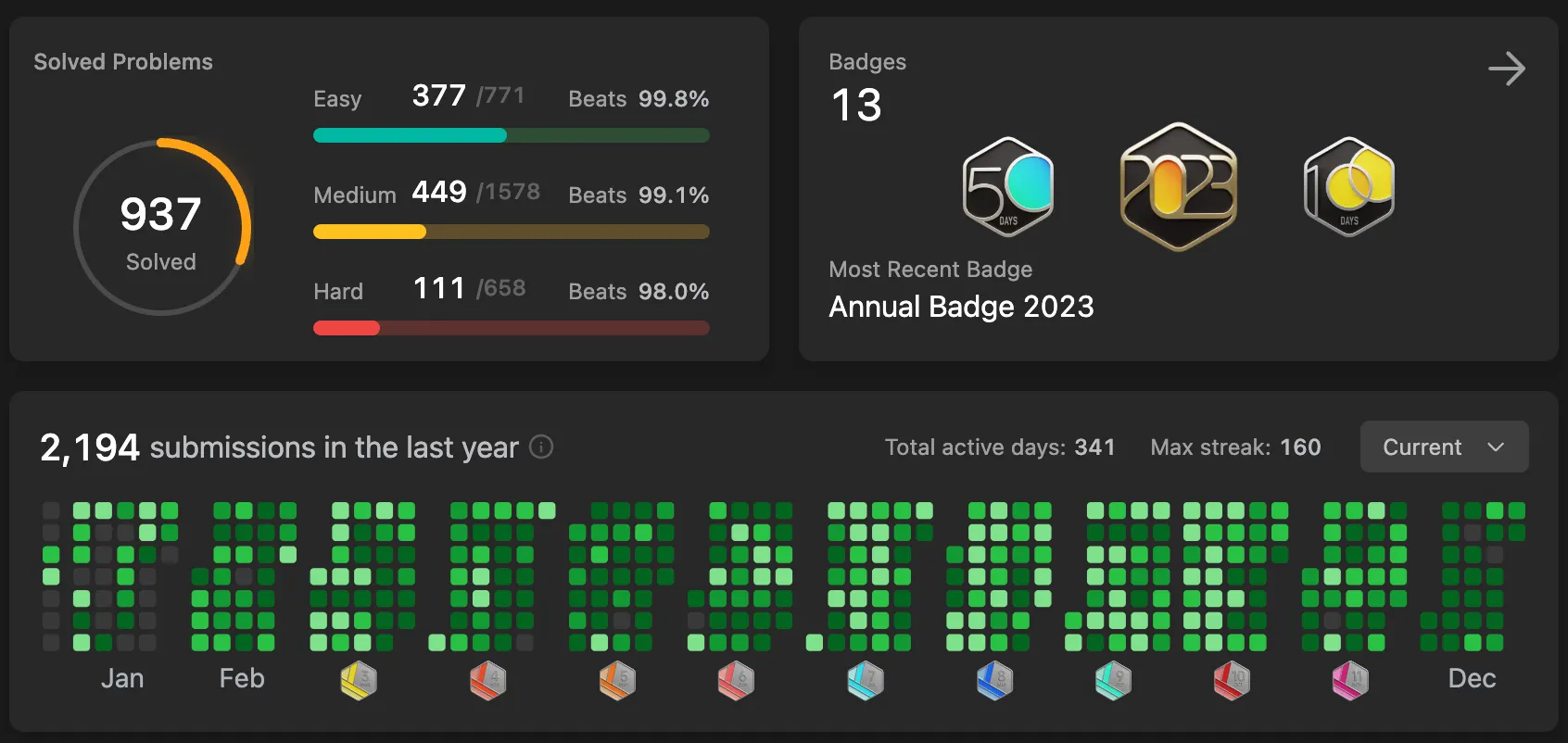올 해 알고리즘이라는 세계를 알게 되고 많이 고생했던 것 같다. 아무리 머리를 쥐어 짜도 답이 안 나오기도 하고, 헷갈리는 것도 너무 많고. 그래도 우직하게 릿코드를 풀었다. 취업하고 난 다음 부터는 기존의 루틴을 가져가지 못해서 너무 아쉽다. 지금은 기억 나면 퇴근 전이나 후에 빠르게 문제만 풀고 넘어간다. 조금 더 시간을 내서 더 좋은 답, 다른 방식의 풀이 등을 고민하고 다른 사람의 코드까지 읽는 루틴이 있었는데 시간을 내야겠다.