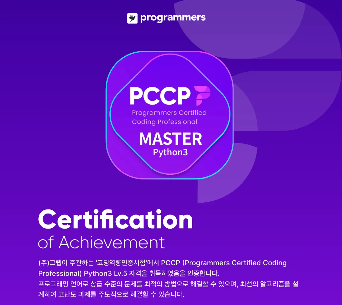 현대모비스 알고리즘 경진대회에 참여했던 것도 Programmers를 통해서 였는데, 이번에도 Programmers에서 진행한 프로그램? 과정?에 참여해서 무료로 PCCP에 참여할 수 있는 기회가 생겼다. 그래서 시험 치른 김에 인증서도 저장해뒀다.