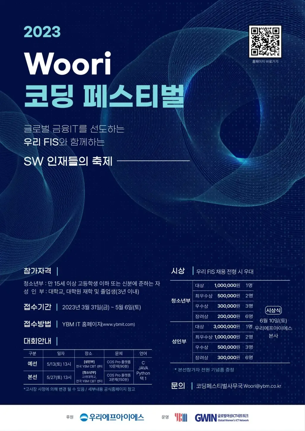 우연한 기회에 2023 Woori 코딩페스티벌에 참여하게 되었다. 알고리즘 공부를 시작한 지도 어느덧 반 년 이상이 지났지만, 기업 코딩테스트가 아닌 대회에 참여한 것은 처음이었다. 참여비도 없고 떨어진다고 해서 불이익이 있는 것도 아니라서 가벼운 마음으로 참여했다. 이번 경험을 통해 느낀 점을 간단하게 기록하고자 한다.