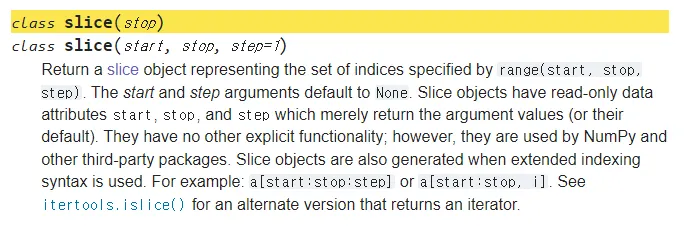 파이썬에서는 slice라는 built-in function을 통해 slice 객체를 생성할 수 있다. 공식 문서를 살펴보면,