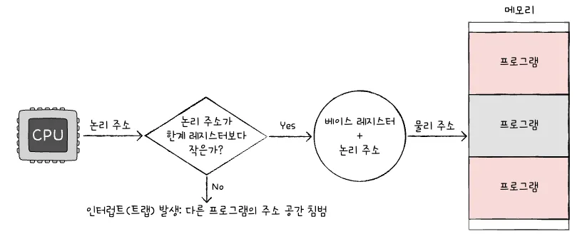 CPU는 메모리에 접근하기 전에 항상 접근하고자 하는 논리 주소가 한계 레지스터보다 작은지를 검사