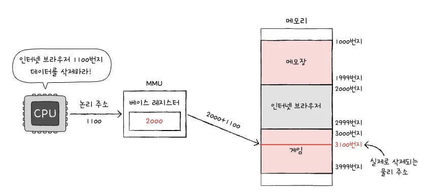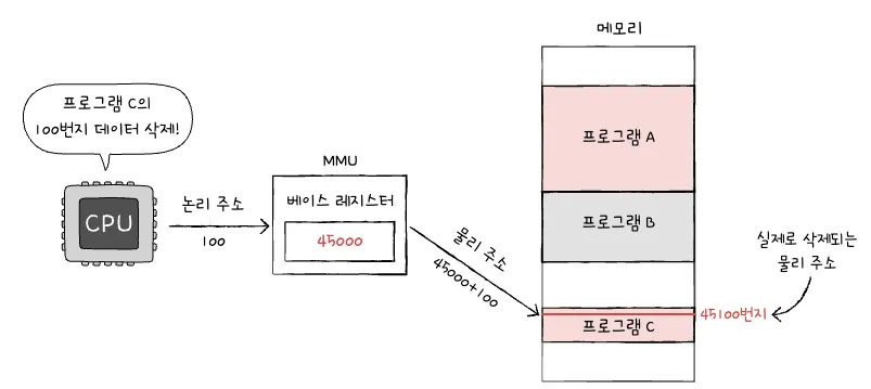 MMU는 CPU가 발생시킨 논리 주소에 베이스 레지스터 값을 더하여 논리 주소를 물리 주소로 변환