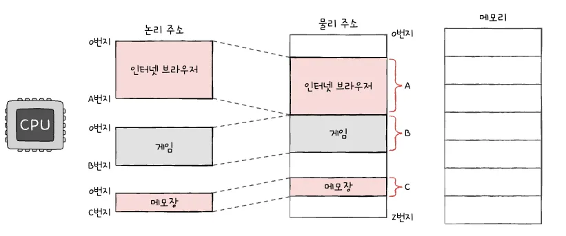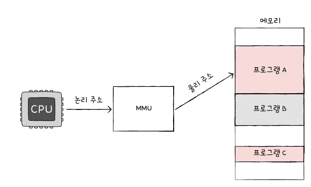 논리 주소와 물리 주소 간의 변환은 CPU와 주소 버스 사이에 위치한 메모리 관리 장치 (MMU, Memory Management Unit)이라는 하드웨어에 의해 수행