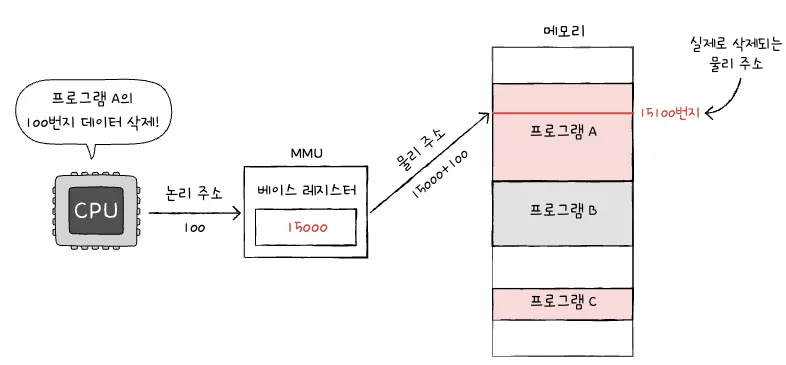예를 들어, 베이스 레지스터=15000, 논리주소=100 → 물리주소 = 15100